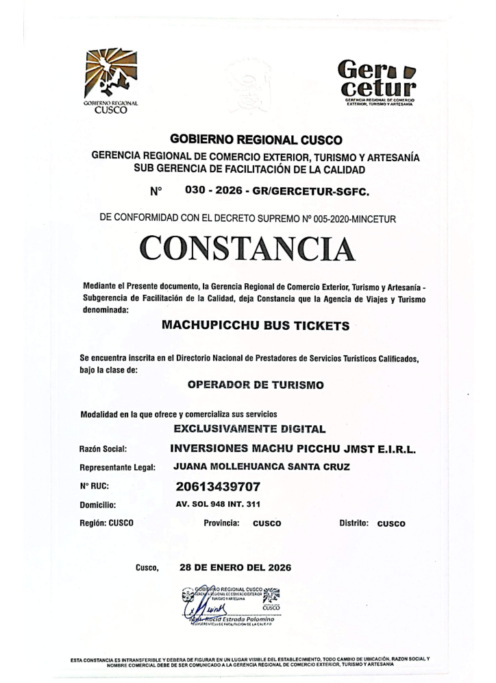 Operador certificado por la GERCETUR para brindar servicios turísticos en la región.